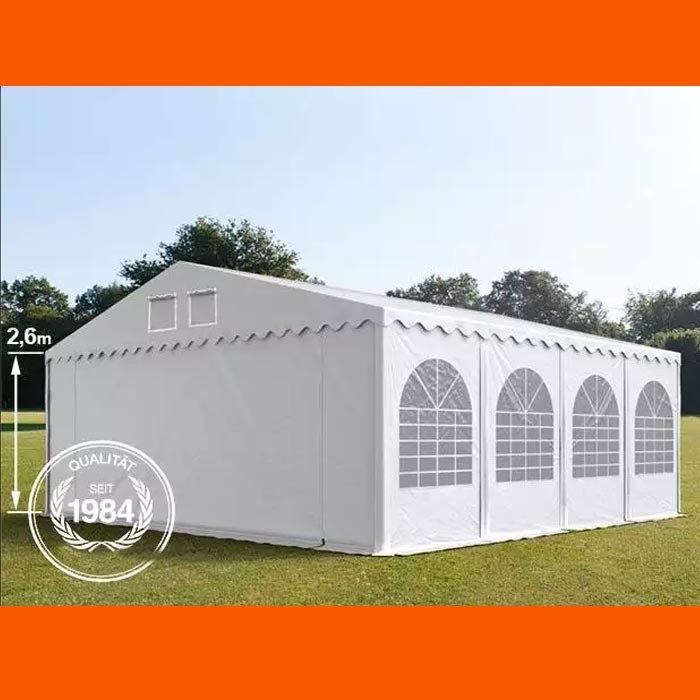 Con una altura lateral de aproximadamente 2.6 m, esta carpa para fiestas ofrece espacio adicional. Tiene una pluma extremadamente robusta y relativamente más gruesa, que está equipada con un marco de piso y refuerzos de techo adicionales. Las lonas de PVC de aproximadamente 550 g / m² de calidad son extremadamente duraderas, resistentes a la intemperie y 100% impermeables. La lona tiene un tejido interior de rejilla resistente a la rotura y un alto SPF de 80+. Las partes laterales se pueden unir individualmente a una distancia de 2 my, por lo tanto, permiten muchas variantes del cuerpo. Esta carpa para fiestas particularmente resistente y muy estable es ideal para usar durante todo el año. Para esta carpa para fiestas, ofrecemos una garantía de compra de 10 años de repuestos a partir de la fecha de compra.