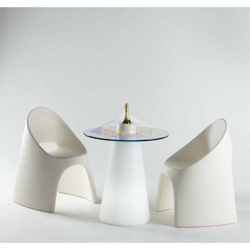 Feito de polietileno pela técnica de rotomoldagem e vidro.
