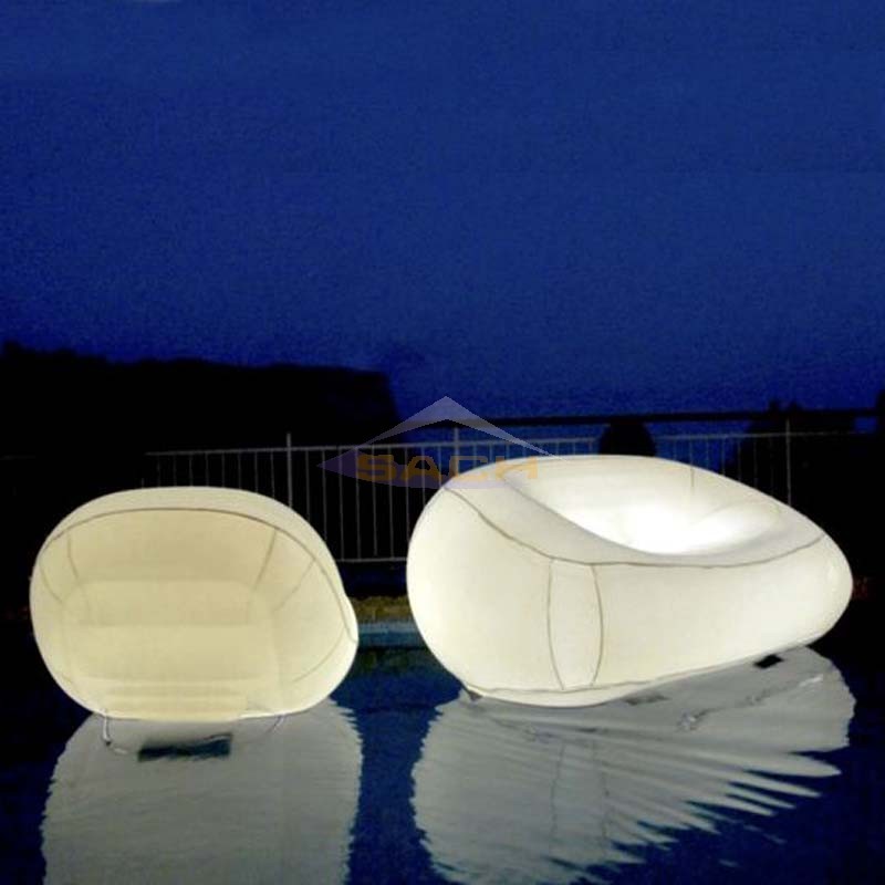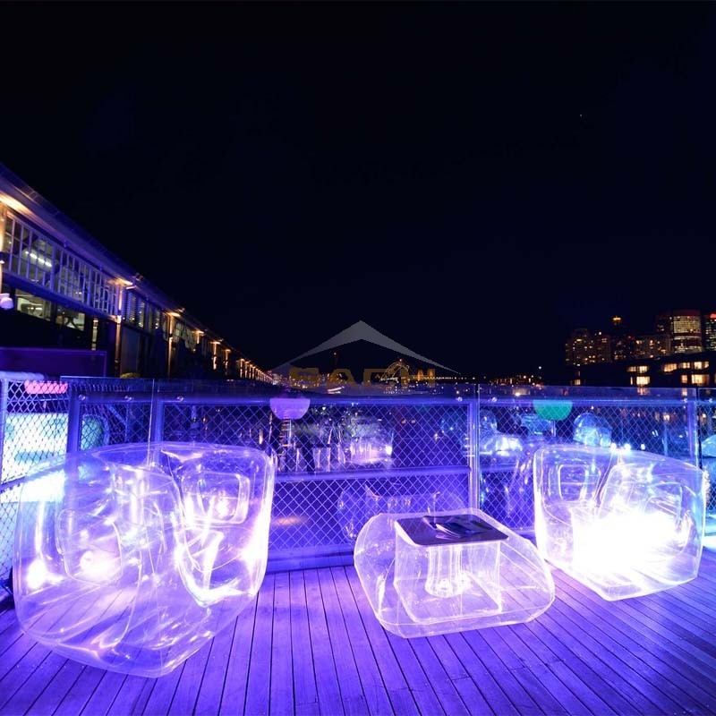 Luz LED para móveis inflável. Integrando lâmpadas LED no interior do móveis dá um luz uniforme. As luzes são completamente à prova d'água e é recarregada sem fio. Recarga levará cerca de 6 horas e pode ser utilizado para entre 13 e 29 horas, dependendo do programa utilizado. Eles vêm com controle remoto.