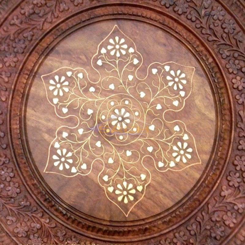 Mesa árabe dobrável redonda em madeira entalhada esculpida em decoração árabe.