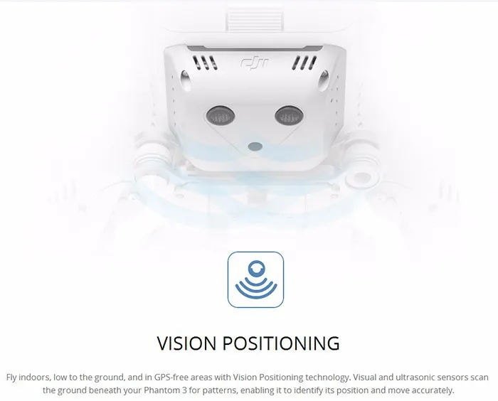 Voar dentro de casa, baixo para o chão, e em áreas gps-livre com tecnologia de posicionamento de visão. Os sensores visuais e ultrassônicos escaneiam o solo sob seu profissional phantom 3 para padrões, permitindo-lhe identificar sua posição e mover-se com precisão.
